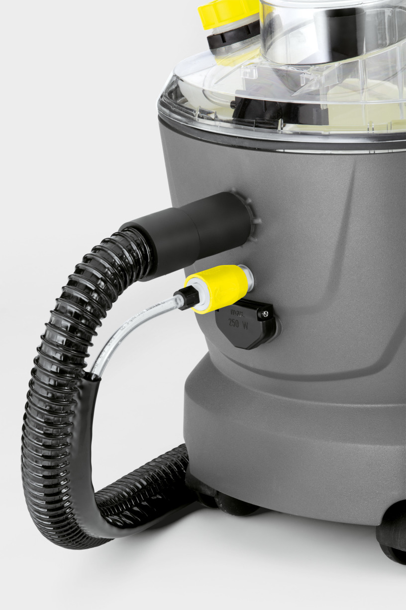 L'injecteur-extracteur professionnel Puzzi 10/2 Adv de Kärcher offre une très bonne puissance d'aspiration et permet d'obtenir d'excellents résultats de nettoyage hygiéniques, ainsi qu'une remise en état rapide des surfaces textiles. À cet effet, l'appareil d'injection-extraction injecte la solution de nettoyage jusqu'au cœur des fibres textiles puis la réaspire en décollant en même temps la saleté : il convient ainsi parfaitement au nettoyage des tapis/moquettes et autres surfaces textiles. Une tête de lavage Power disponible en option et sa brosse-rouleau rotative permettent d'augmenter le rendement surfacique et d'intensifier la puissance de nettoyage. Le dosage en solution antimousse intégré permet notamment d'éviter toute formation excessive de mousse dans le réservoir d'eau sale lors du rinçage de moquettes shampouinées. Le format robuste et compact du Puzzi 10/2 Adv garantit une longue durée de vie et donc une rentabilité élevée. Il est idéal pour les entreprises de nettoyage de bâtiments ou l'hôtellerie et la restauration. Pour mieux voir l'eau sale, le couvercle de l'appareil ainsi que le suceur pour sol sont transparents. Contenus dans la livraison : suceur pour tapis/moquette de 240 mm, raccordement pour tête de lavage PW Power, logement pour tablettes RM, poignée de transport ergonomique et crochet pour ranger le câble.