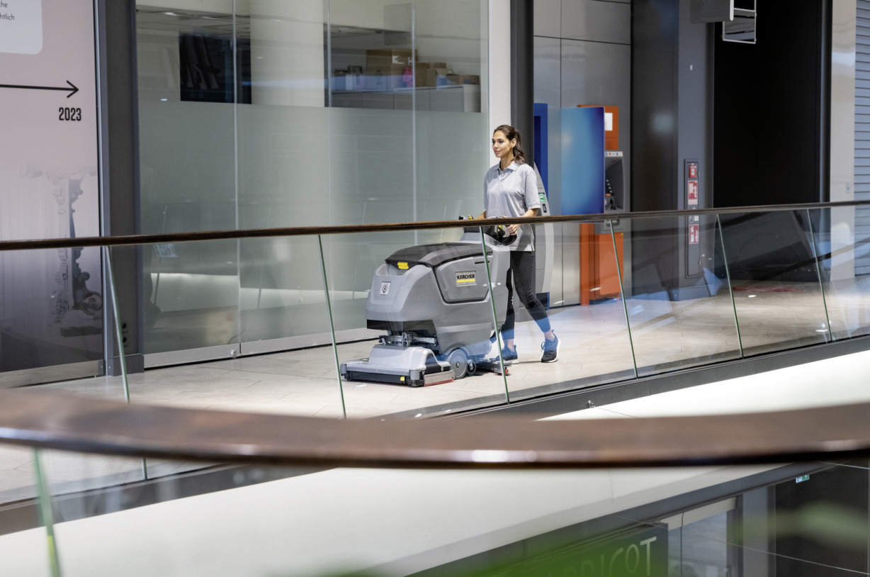 Autolaveuse aspirante compacte B 50 W Bp pour le nettoyage humide des sols avec des composants robustes en aluminium, puissante batterie AGM de 115 Ah, système de dosage, tête de brossage R 55 et fonction Auto-Fill/Auto-Rinse.