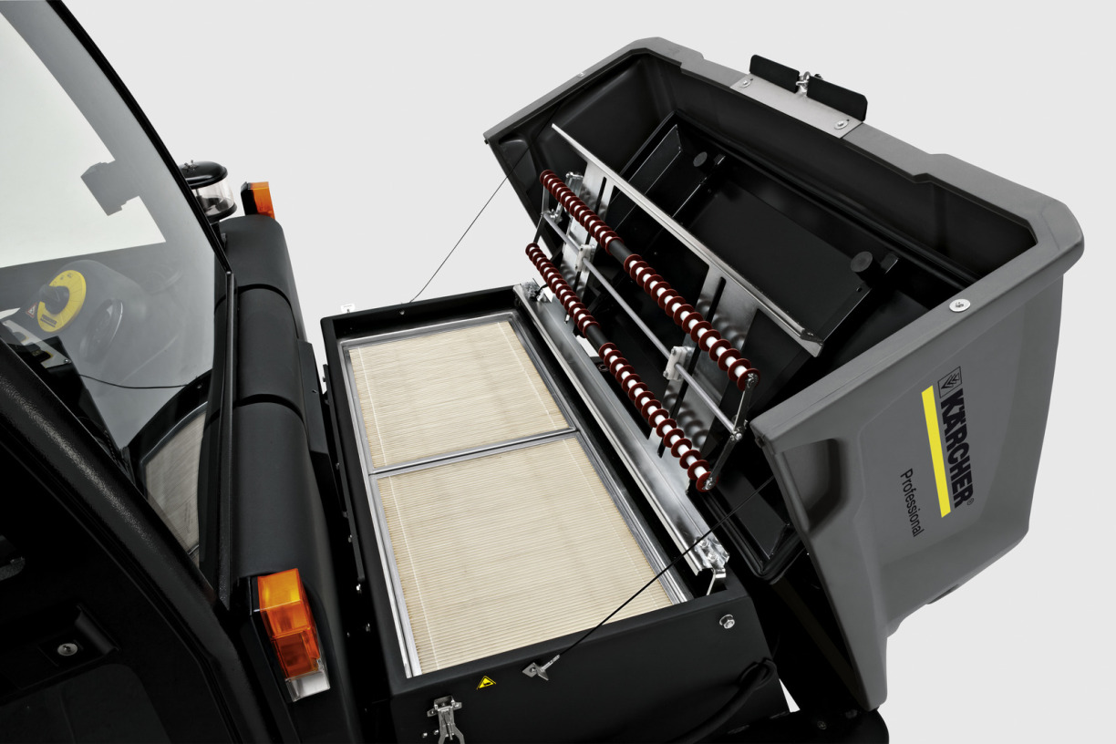 Robuste et entièrement hydraulique, la balayeuse industrielle KM 150/500 R LPG fonctionnant au GPL et utilisable en intérieur comme en extérieur convient aux applications extrêmes, par exemple dans les usines de matériaux de construction, les usines métallurgiques ou les fonderies et autres entreprises produisant des salissures importantes. Grâce au principe de balayage par poussée, les salissures fines et grossières sont parfaitement ramassées. Le rouleau de balayage s'adapte automatiquement aux irrégularités du sol et le système de balayage innovant réduit l'usure au minimum. Le rouleau de balayage principal peut être remplacé en un tour de main sans outil. La cuve à déchets se ferme automatiquement pendant le transport. Deux filtres plissés plats installés à l'horizontale garantissent un air pur, même dans des environnements très poussiéreux. Le décolmatage du filtre s'effectue par simple pression sur un bouton à l'aide d'une double raclette extrêmement efficace. Le filtre est aisément accessible et peut être remplacé facilement sans outil. Le moteur est tout aussi facile d'accès. Grâce au concept EASY Operation, les fonctions de base peuvent être commandées en toute simplicité à l'aide d'un bouton rotatif. Un préfiltre cyclone purifie l'air avant même qu'il ne pénètre dans le filtre du moteur, augmentant ainsi considérablement sa durée de vie.