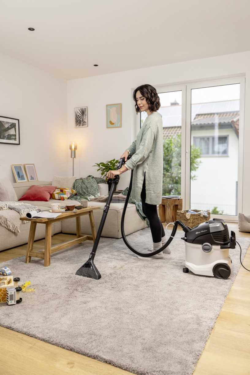 L'injecteur-extracteur SE 6 Signature Line nettoie les surfaces textiles particulièrement en profondeur et garantit une hygiène jusqu'au cœur des fibres. Idéal pour les familles, les personnes souffrant d'allergies et les foyers avec des animaux.