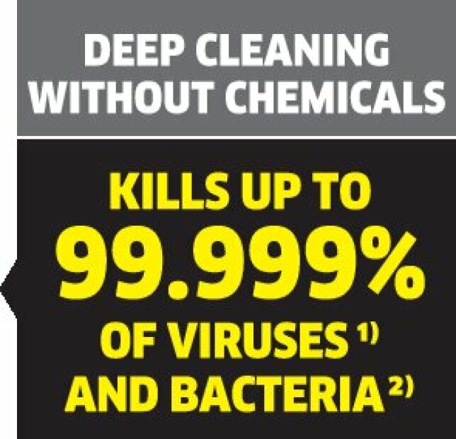 * Lors d’un nettoyage ponctuel avec le nettoyeur vapeur Kärcher, c.-à-d. avec une durée de vaporisation de 30 secondes en mode vapeur maximal et en contact direct avec la surface à nettoyer, 99,999 % des virus enveloppés tels que les virus de la grippe (à l’exception du virus de l’hépatite B) sont éliminés des surfaces dures lisses courantes de la maison (germe d’essai : virus modifié de la vaccine Ankara). ** Lors d’un nettoyage à une vitesse de nettoyage de 30 cm/s, en mode vapeur maximal et en contact direct avec la surface à nettoyer, 99,99 % de toutes les bactéries domestiques habituelles sont éliminés des surfaces dures lisses courantes de la maison (germe d’essai : Enterococcus hirae).