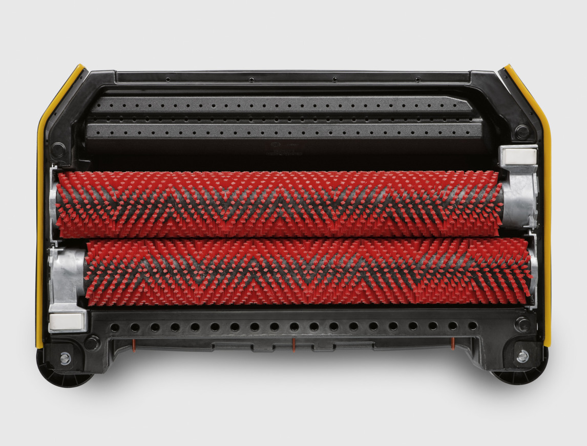 Tête de brossage avec 2 brosses-rouleaux et une largeur de travail de 75 cm. Changement des brosses sans outil.