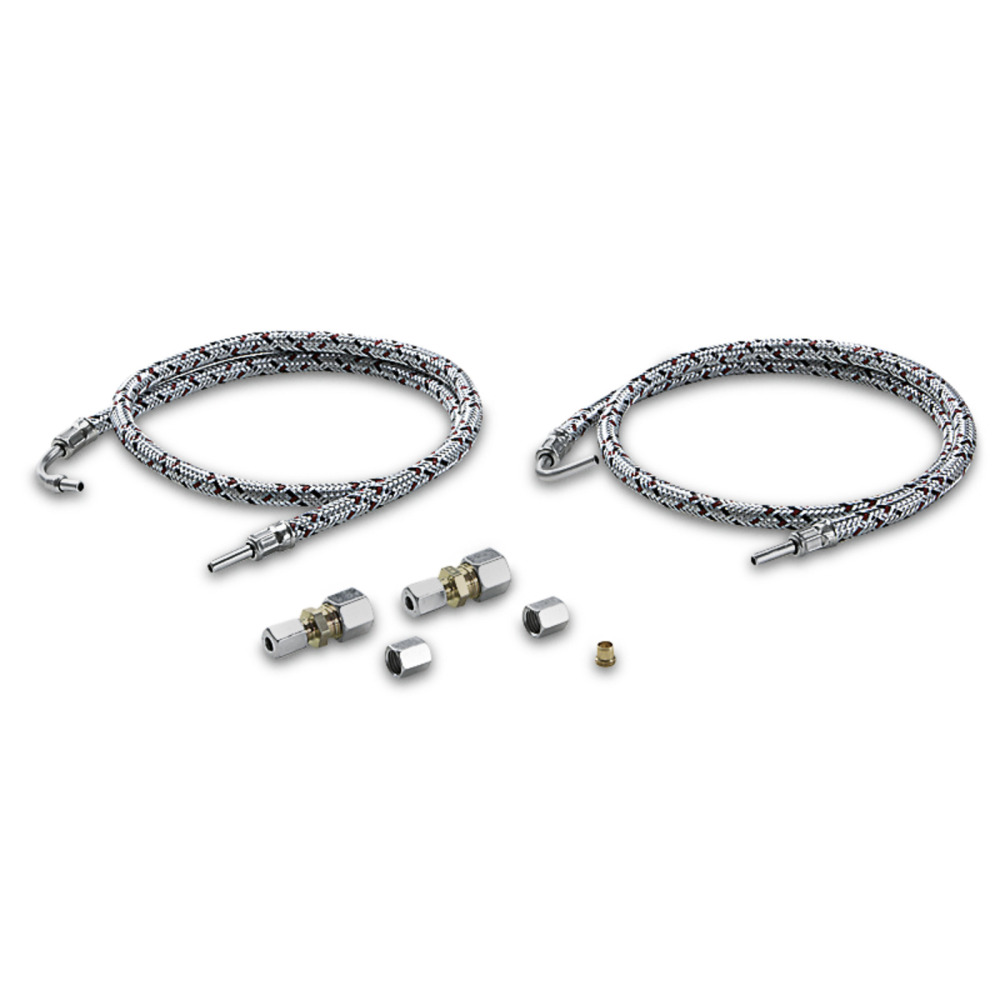 Jeu de flexibles pour l'approvisionnement en fioul des HDS stationnaires. Contient: 2 flexibles pour fioul (DN 4, 1m) pour l'amenée et le retour, 2 raccords filetés à bague coupante en inox.